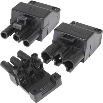 Коннекторы трехполюсные (комплект, разъемы female+male) RUICHI ТР-008-3, 16 А, 400 В, пластиковые, черные применяются для монтажа электропроводки на выставочных стендах, в производственных и офисных помещениях.